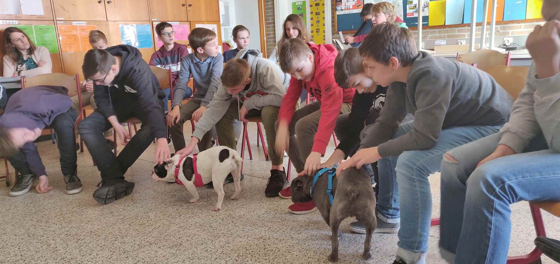 Deze week kwam 'Chez Swa' bij de B-stroom op bezoek met Truusje en Maurice. Er werd de leerlingen verteld over broodfok. Ze leerden waarop ze moeten letten als ze een puppy kopen. Natuurlijk is het beter om er eentje te adopteren: adopt, don't shop! De andere foto's zie je via onze facebookpagina.